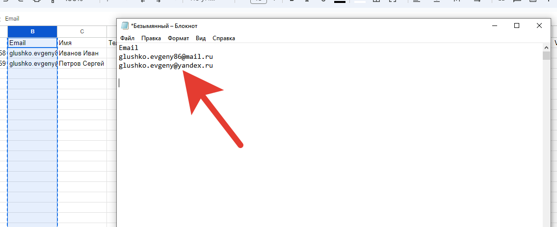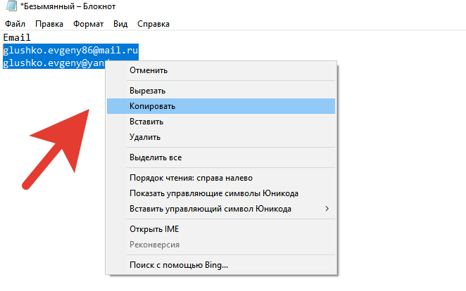 Теперь, копируем список email-адресов из блокнота, который ранее туда вставляли из таблицы экспорта учеников.