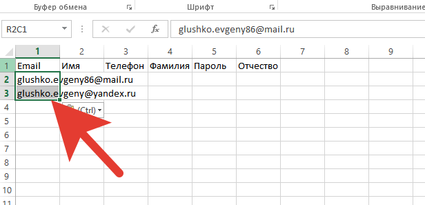 И вставляем скопированный список в таблицу Импорта, в первый столбец таблицы - Email.