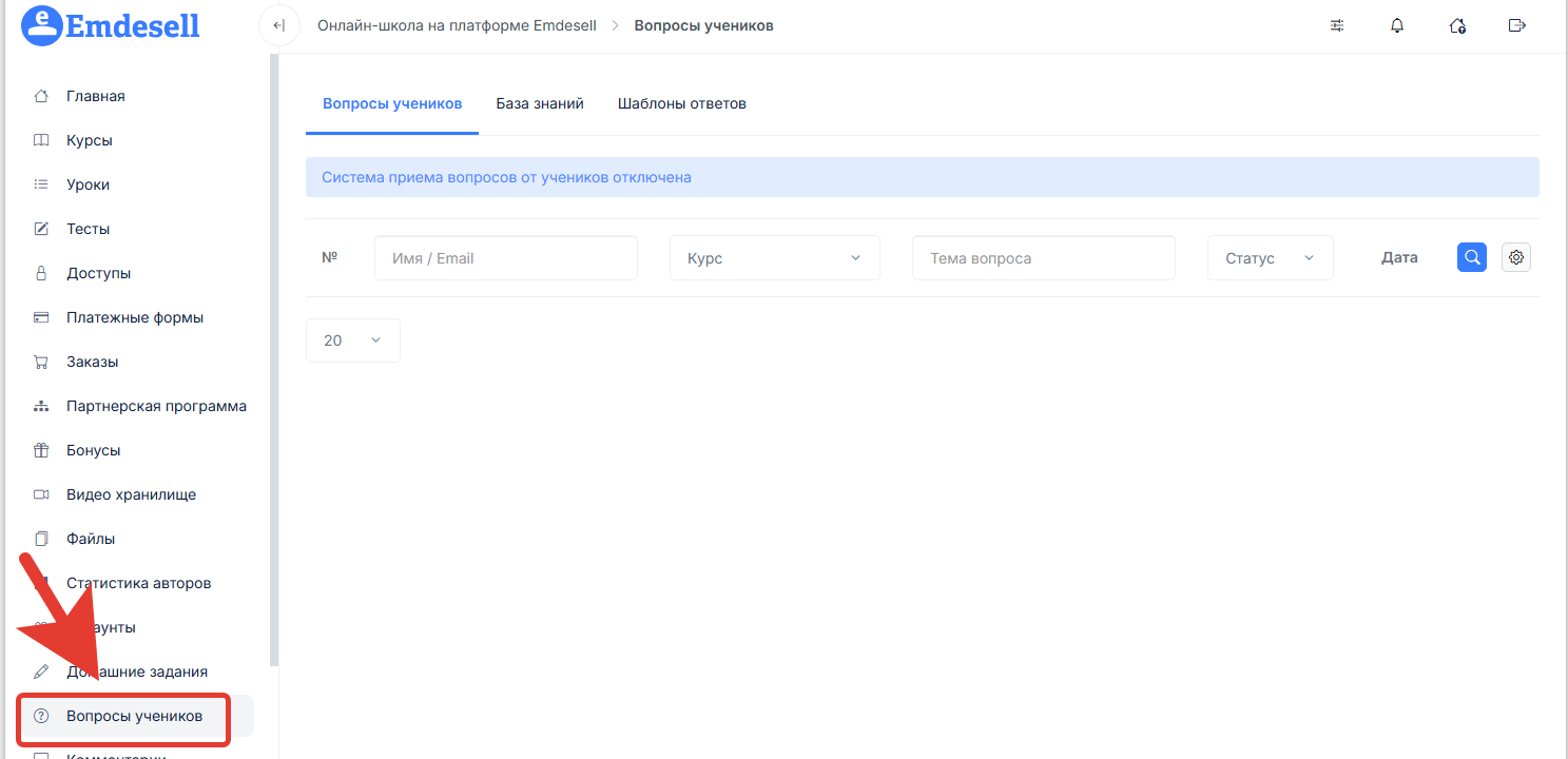 Нужно выйти из кабинета школы в роли администратора и войти еще раз под данными аккаунта автора школы и далее перейти в раздел вопросы учеников