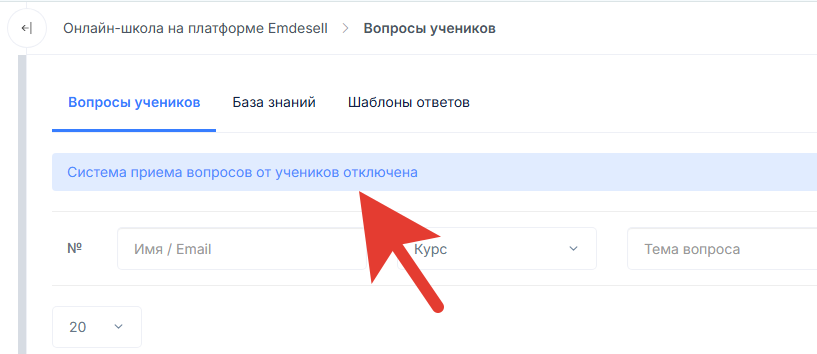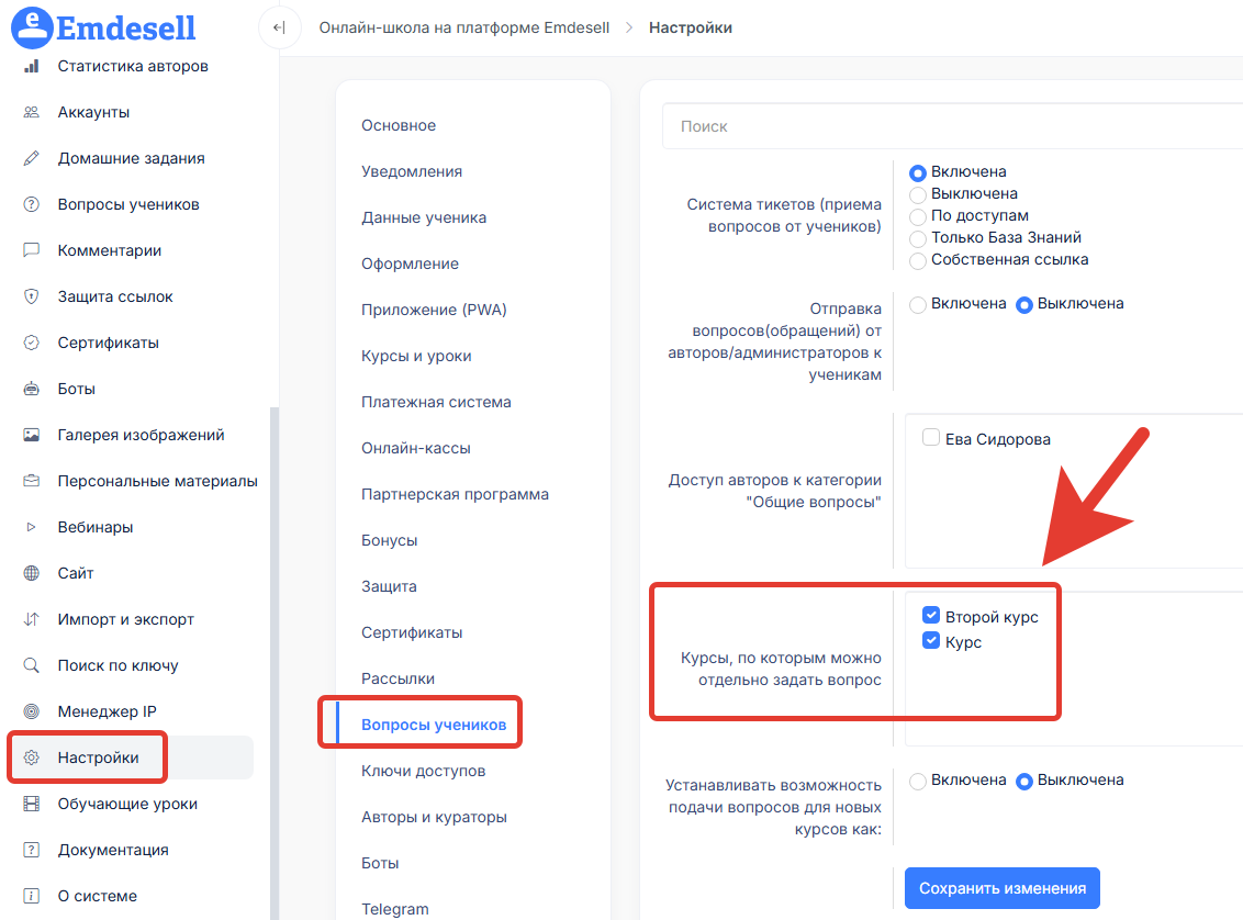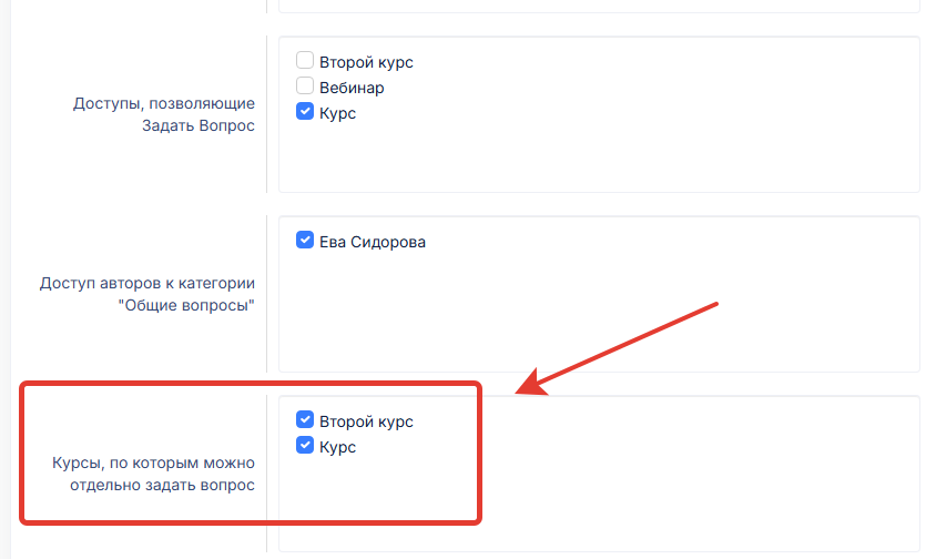 Если необходимо сделать возможность для учеников подачи вопросов по определенному курсу, то тогда нужно включить галочкой курс/курсы в разделе настройки, подраздел вопросы учеников, в опции курсы, по которым можно задать отдельно вопрос