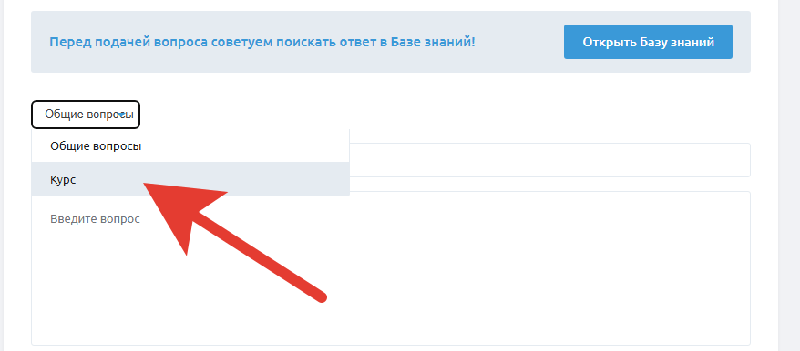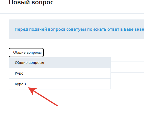 Для проверки, перейдем в роли ученика в школу и увидим в личном кабинете в разделе задать вопрос новую категорию для выбора - Курс 3, т.е. появилась возможность задать вопрос по новому курсу в школе для ученика.