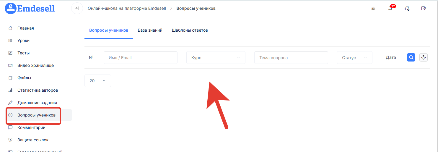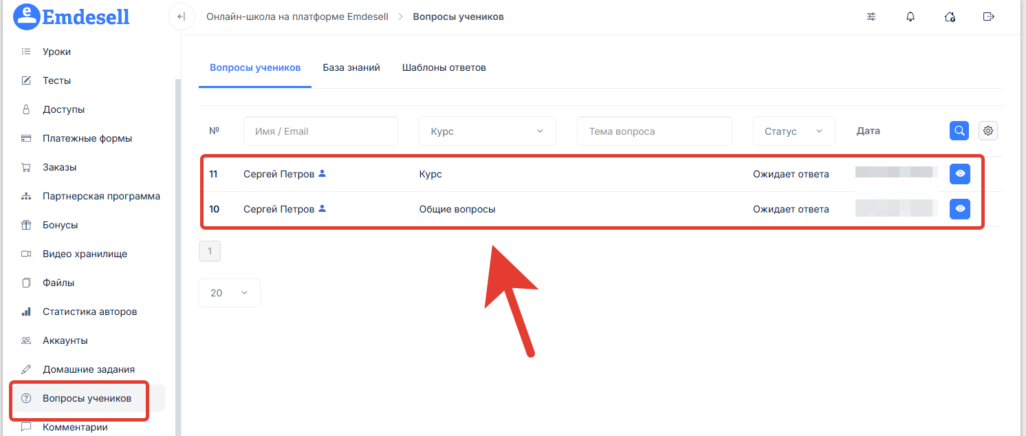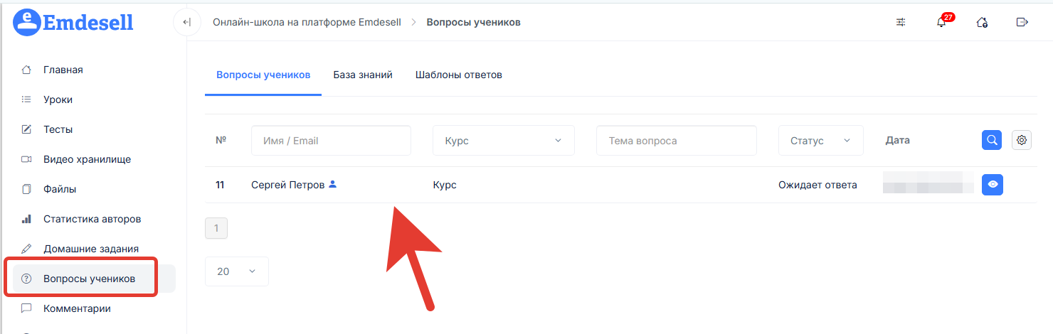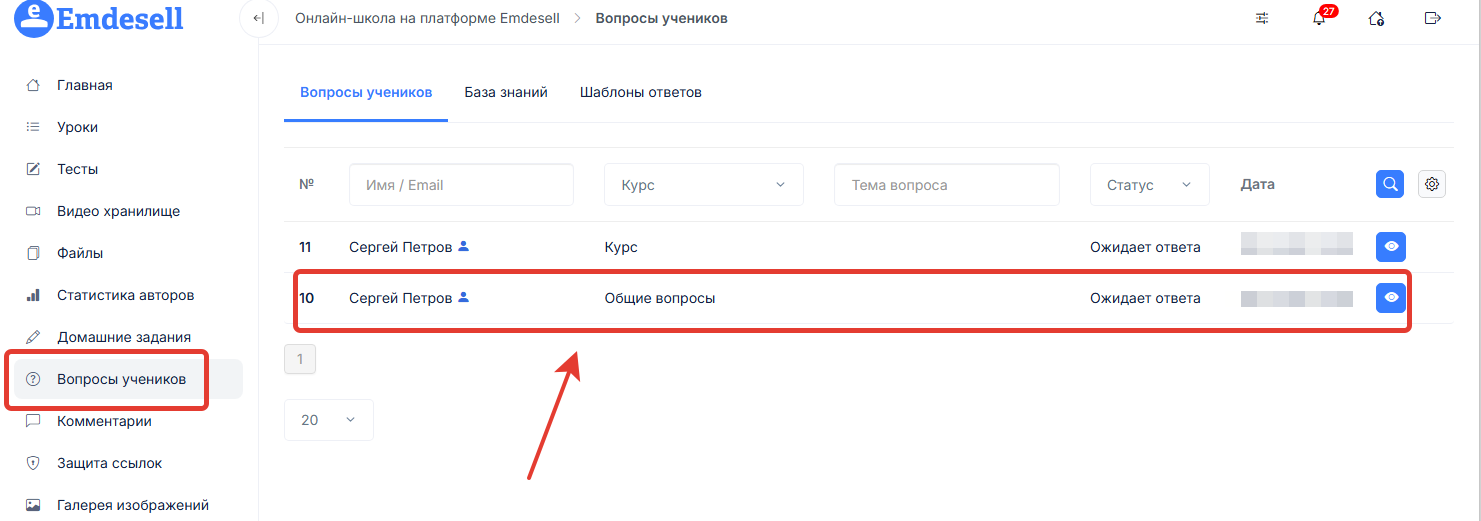 Далее, в разделе школы вопросы учеников, для администратора/автора/куратора школы будет виден новый поступивший вопрос от ученика