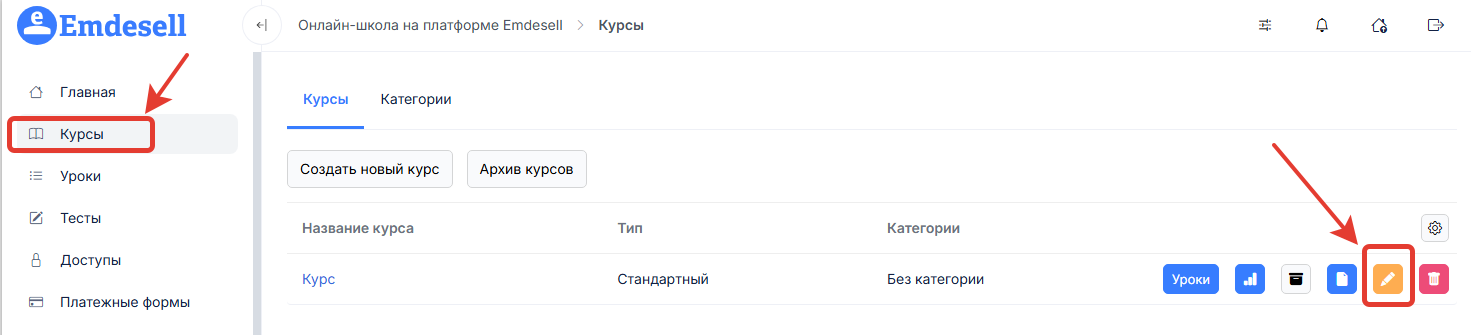 - Перейти от имени администратора школы в раздел курсы и далее в раздел редактирования курса