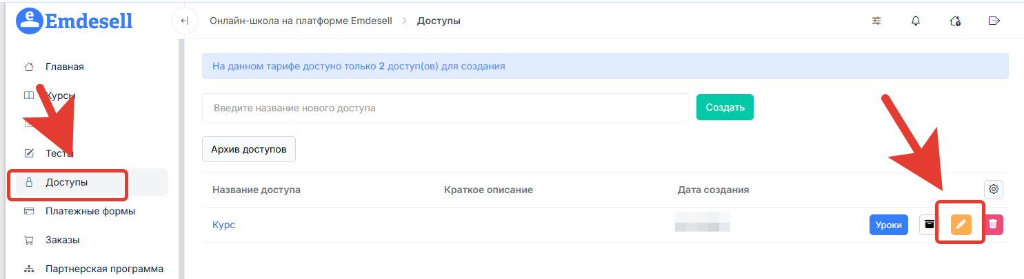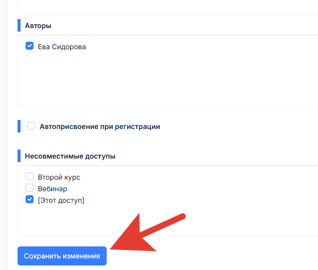 - Далее, перейти в раздел доступы, и далее в раздел редактирования доступа к этому курсу