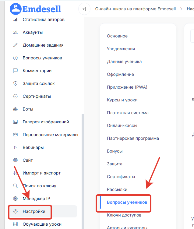 - От лица администратора перейти в раздел школы настройки, далее перейти в подраздел вопросы учеников