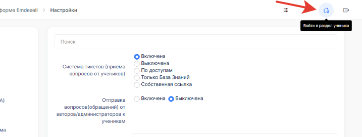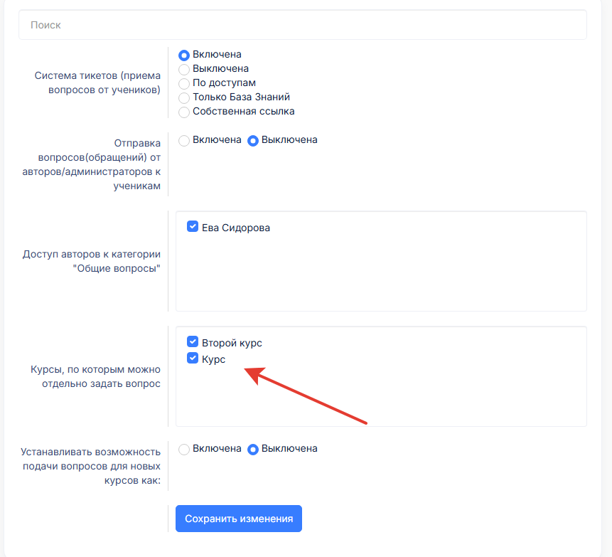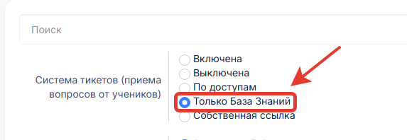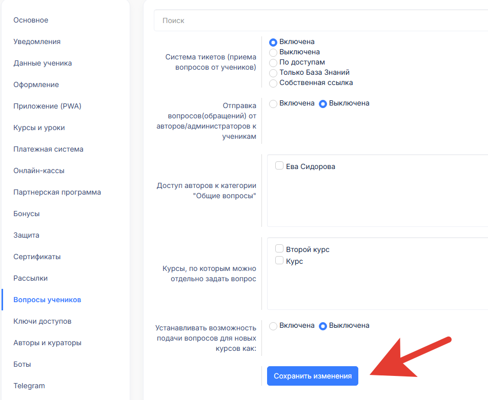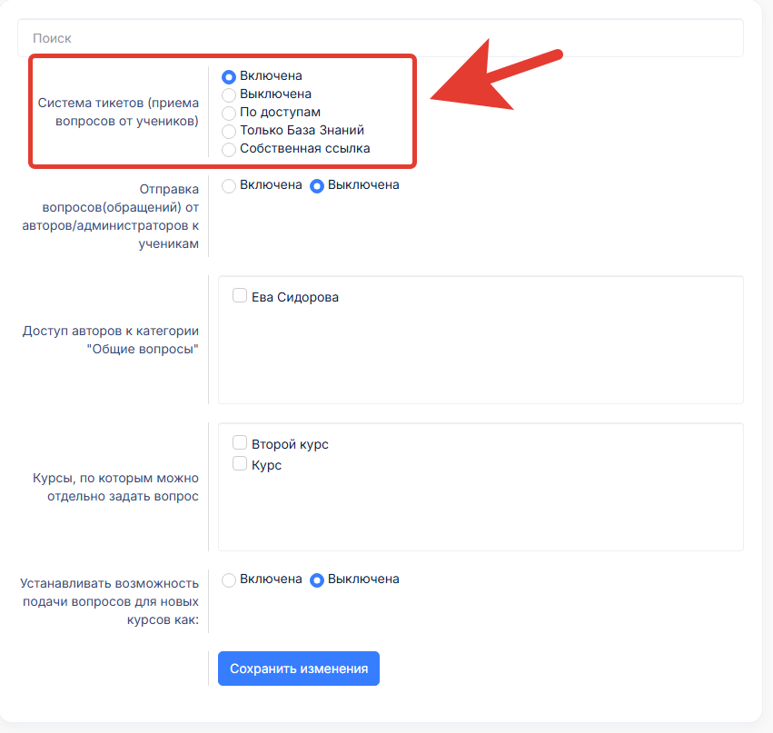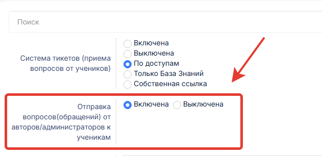 Далее необходимо поменять параметр в опции система тикетов (приема вопросов от учеников) с режима выключена на режим включена