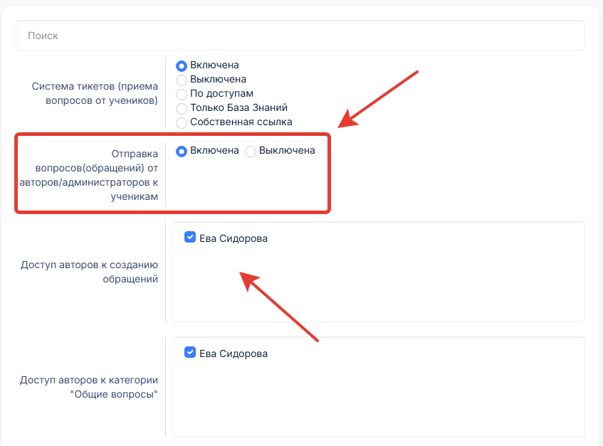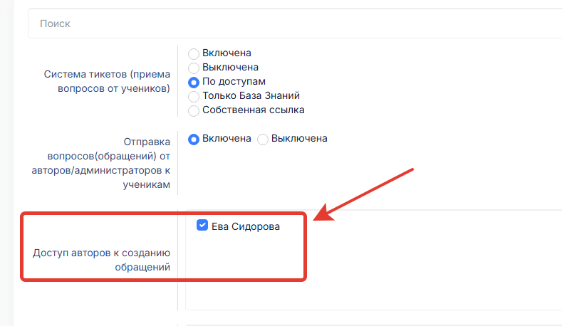 При включении опции системы тикетов по доступам это означает, что задать вопросы могут только те ученики, у которых есть соответствующий доступ (или доступы) в кабинете школы