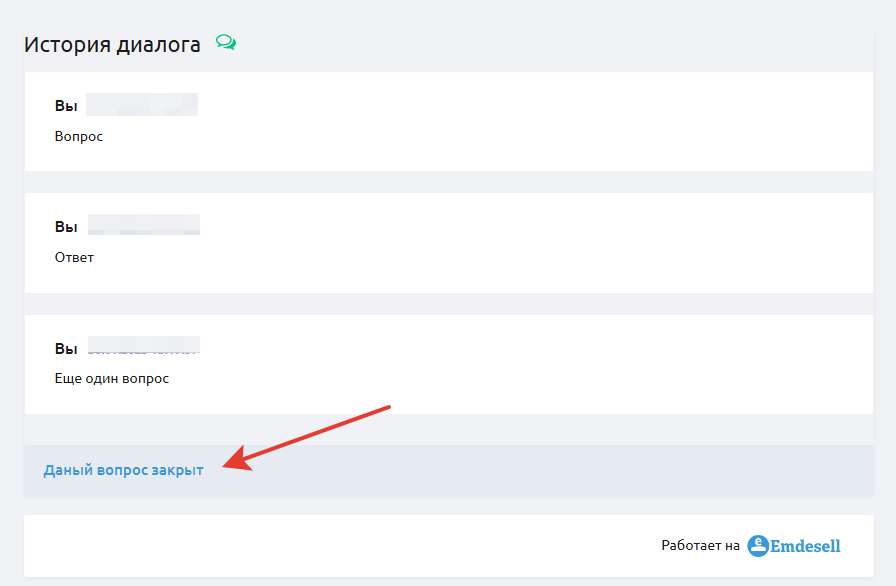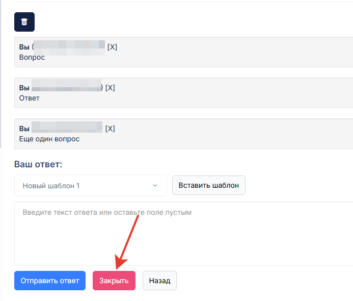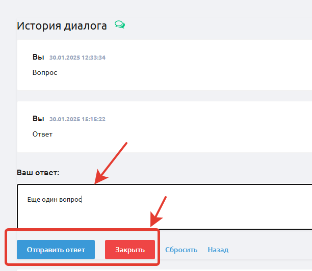 Если ответ получен полностью на заданный вопрос можно закрыть вопрос по кнопке закрыть, или отправить новый вопрос (уточнение по вопросу) в поле ваш ответ и нажать кнопку отправить ответ