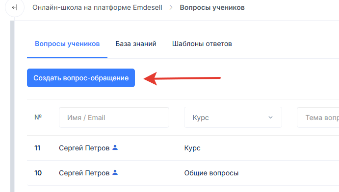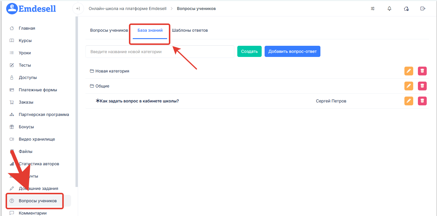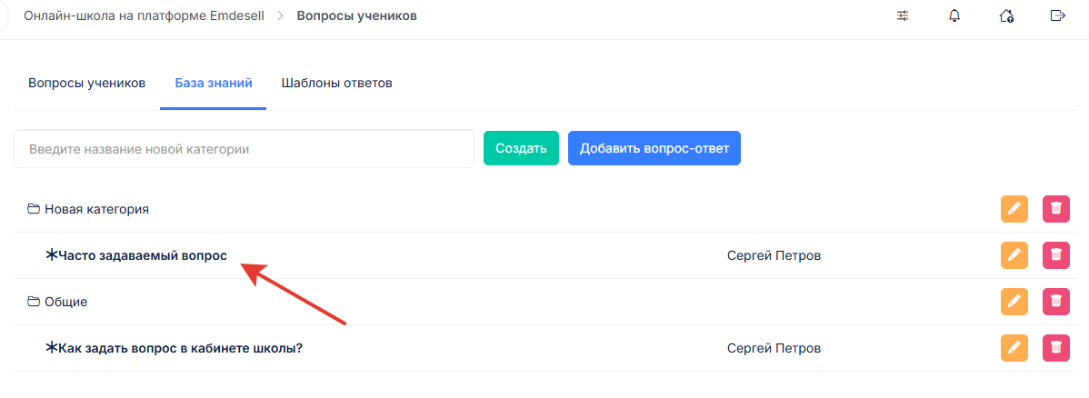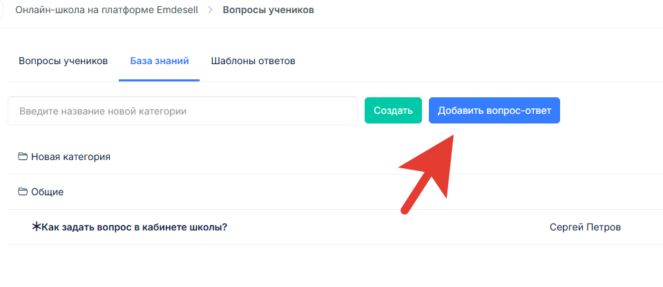 Чтобы создать новые вопросы с ответами в школе для учеников необходимо перейти в раздел вопросы учеников, далее перейти во вкладку база знаний