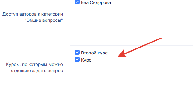 Чтобы добавить категорию по отдельным курсам для отправки вопросов, необходимо отметить соответствующий курс в опции настройки курсы, по которым можно отдельно задать вопрос