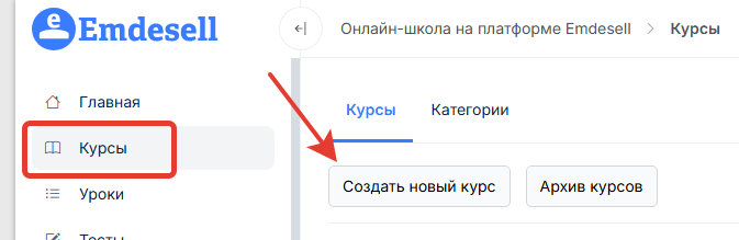 Переходим в раздел курсы и нажимаем кнопку создать новый курс