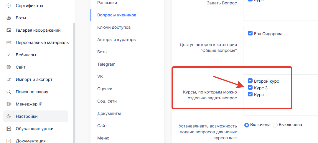 Переходим обратно в раздел настройки, подраздел вопросы учеников и увидим, что этот курс - Курс 3, автоматически отметился в опции