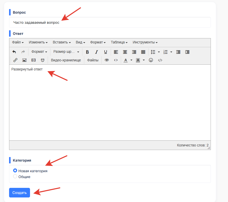 Чтобы создать вопрос-ответ необходимо нажать на кнопку добавить вопрос-ответ