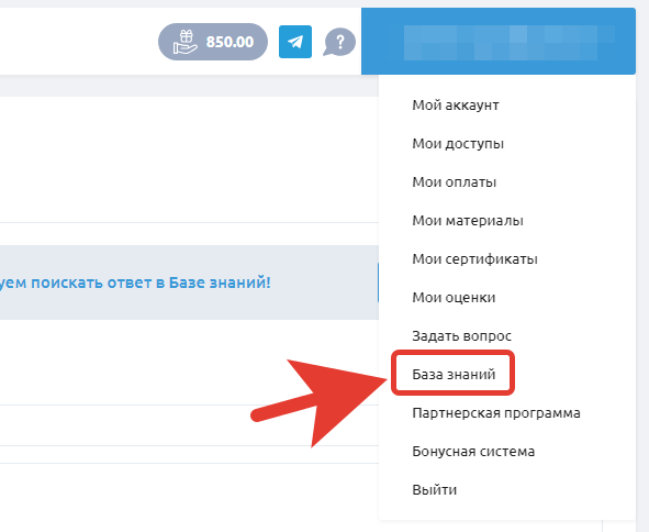 Также, в раздел База знаний можно зайти из меню аккаунта школы по вкладке - База знаний