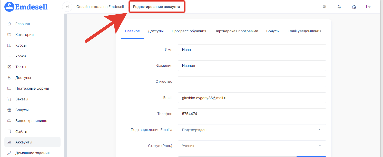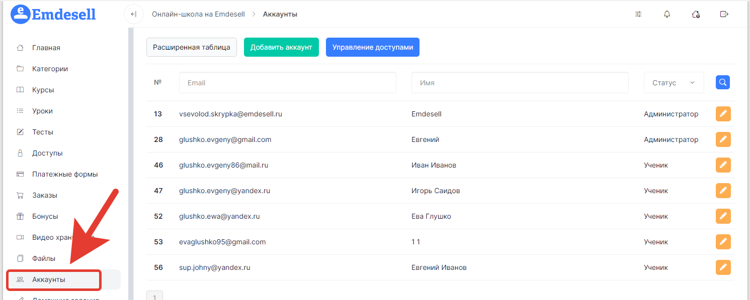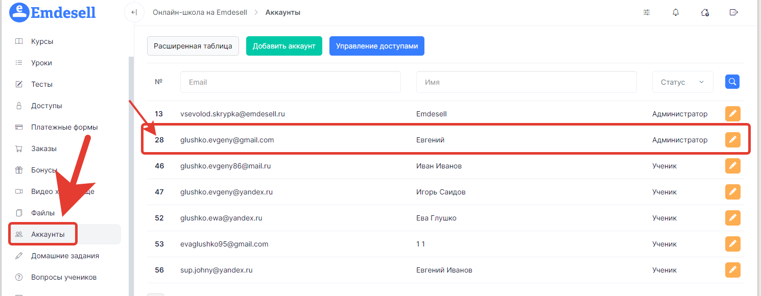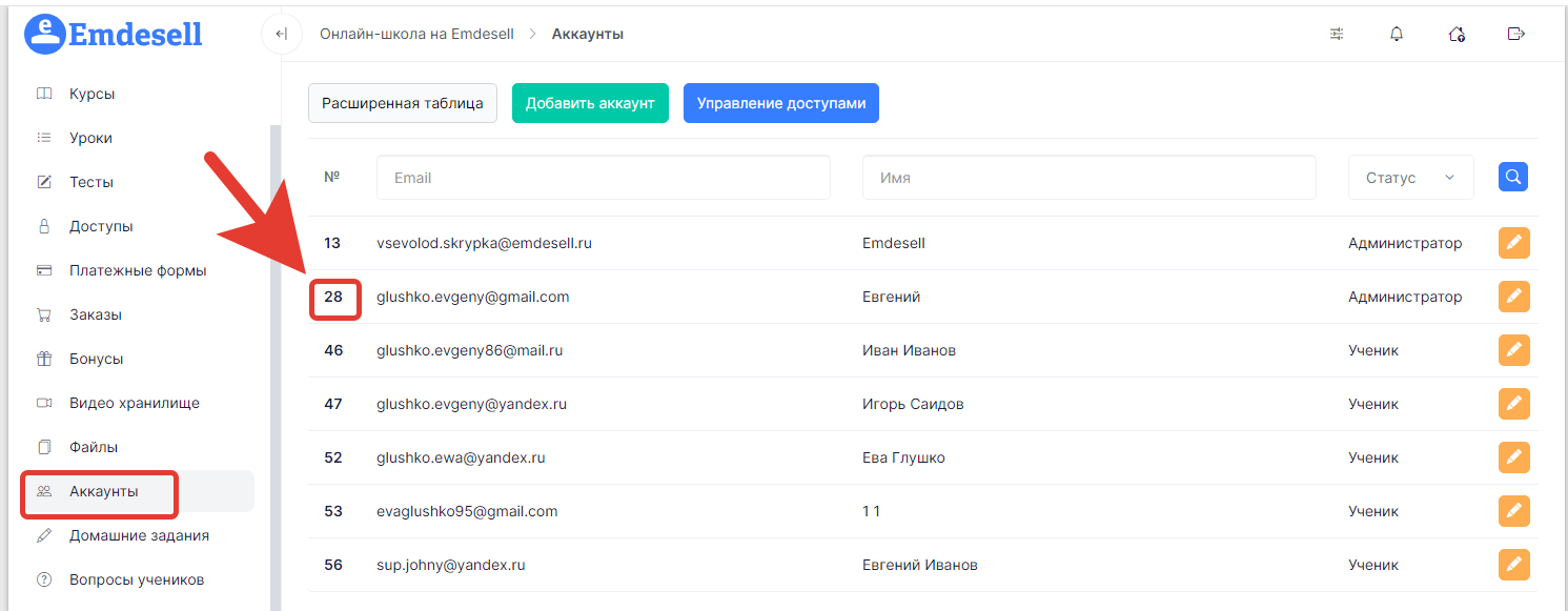 Посмотреть номер ID того или иного аккаунта в школе, можно в разделе Аккаунты.