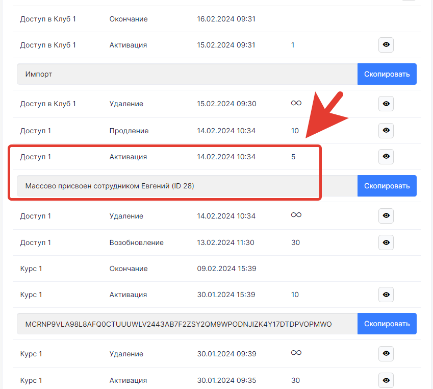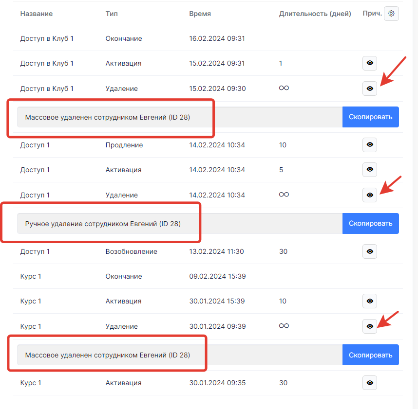 Массово удален сотрудником Евгений (ID 28) - означает, что доступ удален при помощи опции массового удаления (раздел Аккаунты, кнопка - Управление доступами) аккаунтом под номером ID 28.