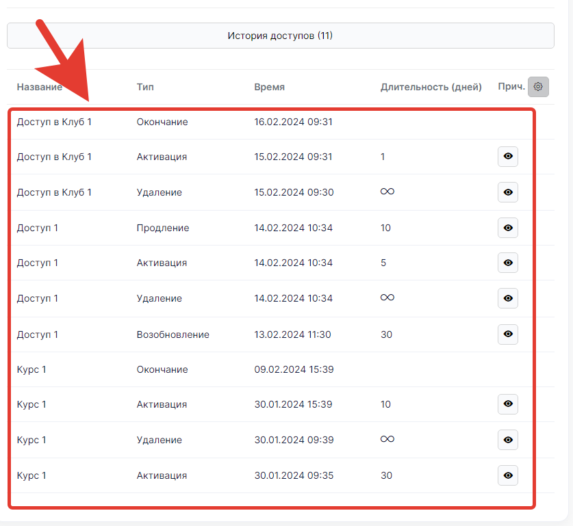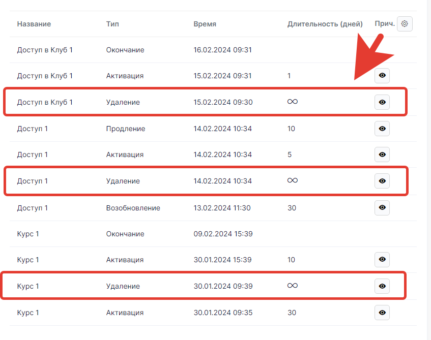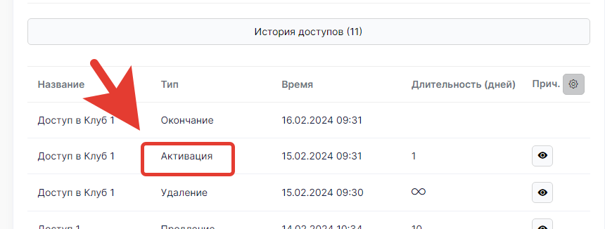 В представленной таблице есть 5 столбцов - Название - название доступа школы, Тип - это тип доступа (рассмотрим далее), Время - дата и время, в которое производили действия (тип) с доступом, Длительность (дней) - кол-во дней, по которому сработал тип доступа, Прич. - причина или полная информация по типу доступа.