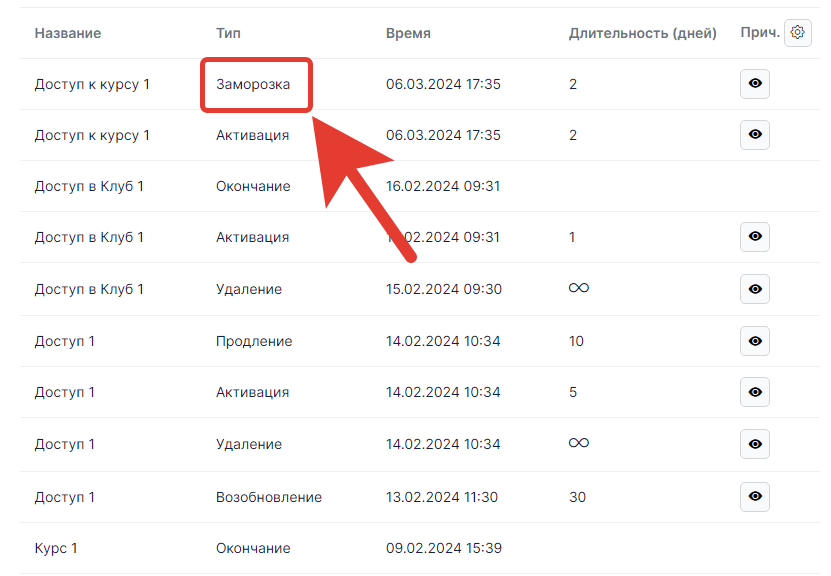 На скриншоте выше представлен пример типа доступа - Заморозка.