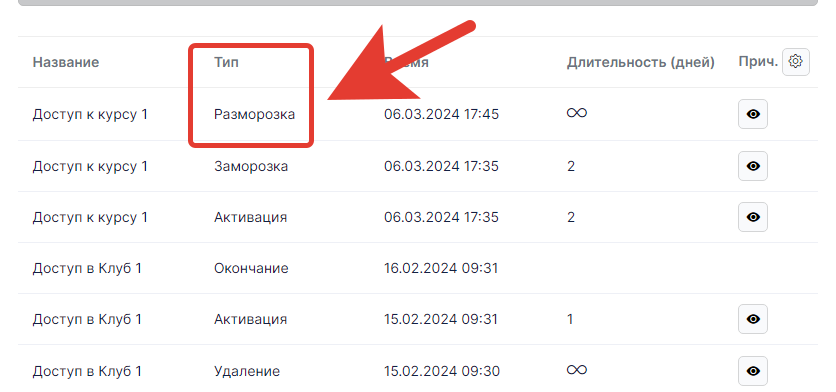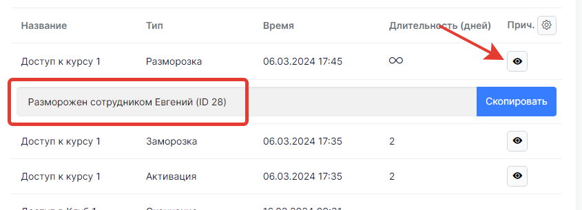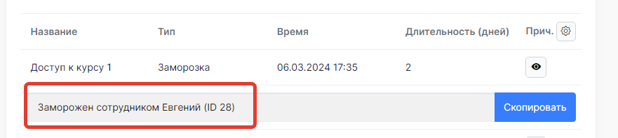 В этом примере стоит Тип - Разморожен сотрудником Евгений (ID 28), что означает, что доступ был разморожен аккаунтов под номером 28 вручную в кабинете школы.