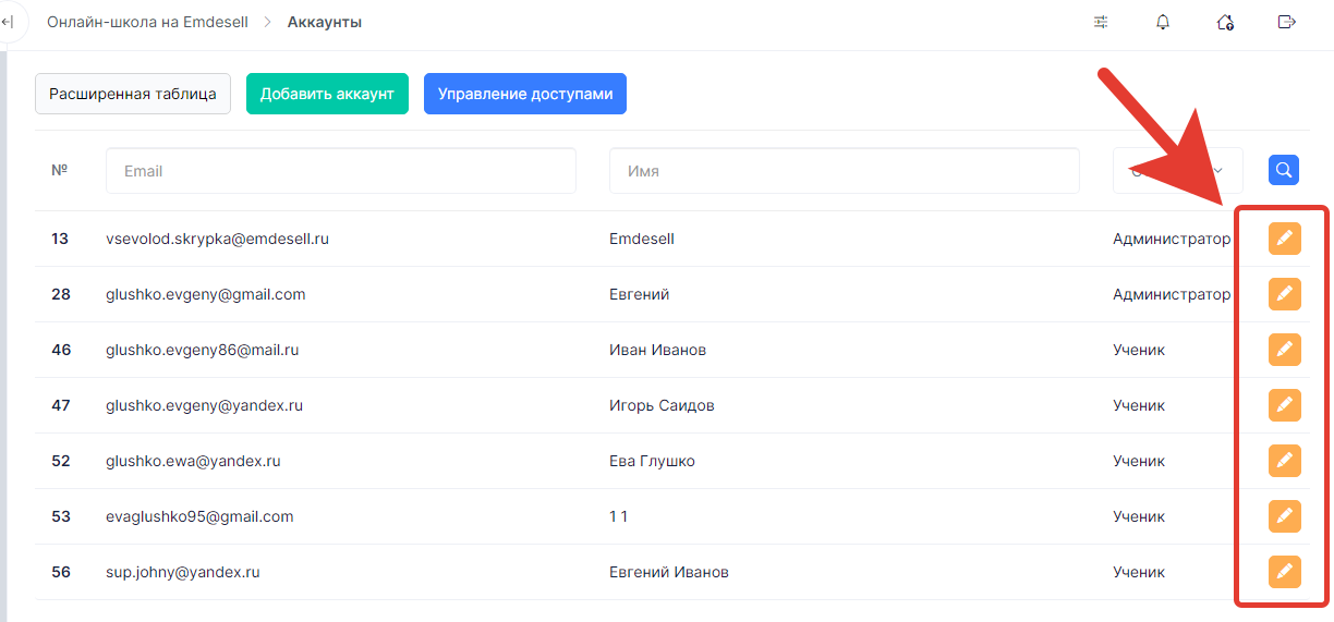 Далее, перейти в раздел редактирования аккаунта школы, по кнопке редактирования (кнопка оранжевого цвета с карандашом).