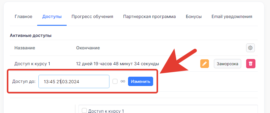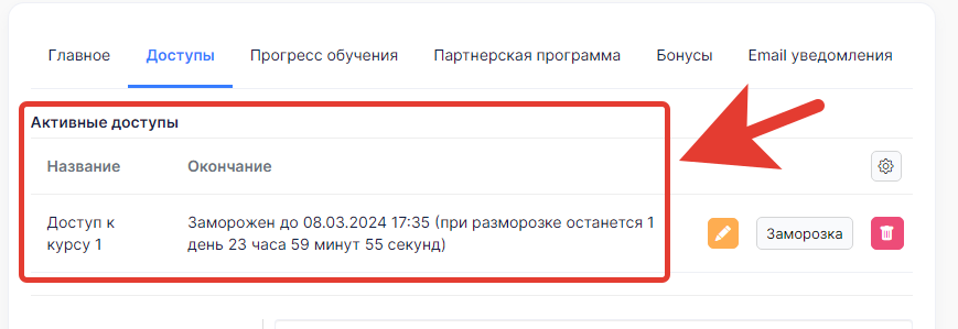 Чтобы проверить какое кол-во времени осталось до разморозки доступа, необходимо подняться выше в этом же разделе редактирования аккаунта, и в опции - Активные доступы - посмотреть информацию о заморозке доступа.