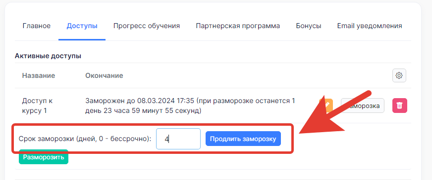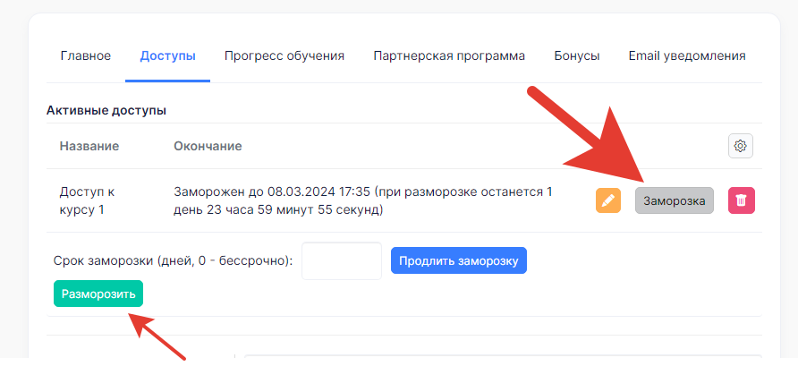 Чтобы разморозить доступ, т.е. снова открыть доступ к курсу для ученика, необходимо будет нажать на кнопку - Заморозка, и в появившемся окне нажать кнопку - Разморозить.