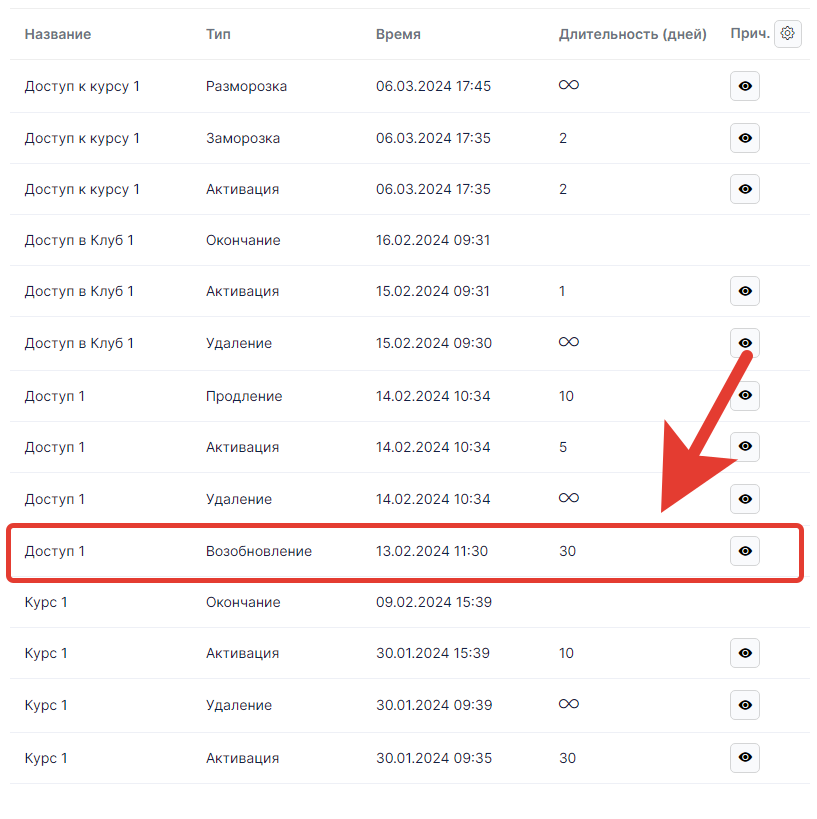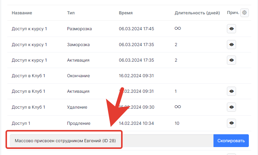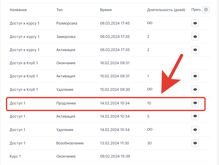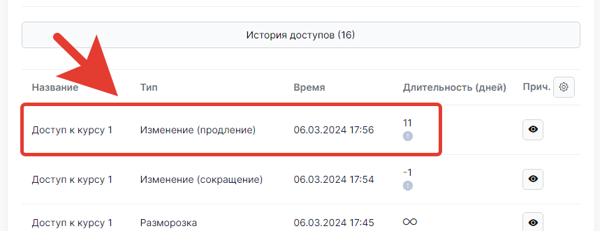 В столбце - Длит. (дней) можно увидеть кол-во дней, на которое был изменен доступ, а в поле доп. информации, каким аккаунтом было произведено данное изменение.