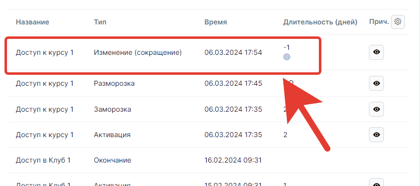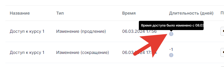 В данном примере доступ был сокращен на 1 день, аккаунтом под номером 28. Также, можно получить информацию - о точных датах по изменению доступа по иконке информации, если навести курсор мышки на воскл. знак.