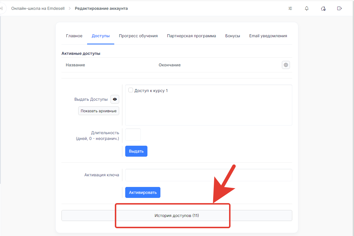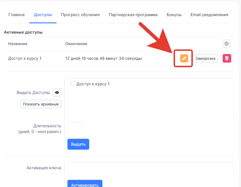 Чтобы изменить кол-во времени у доступа - необходимо в разделе редактирования аккаунта в поле - Активные доступы, нажать на кнопку - редактирования.