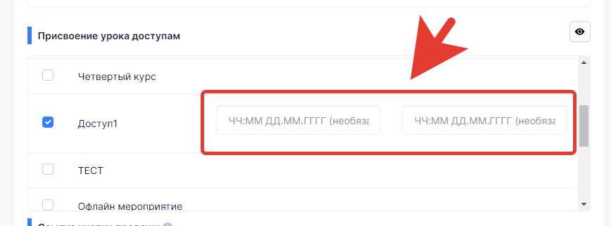 Данная функция дает возможность проставлять точную дату и время открытия/закрытия доступа к уроку в курсе школы.
