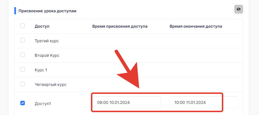 Введем время присвоения доступа (т.к. время и дату, когда урок откроется в курсе) 08:00 10.01.2024, и время окончания доступа (т.е. в это время урок закроется в курсе) — 10:00 11.01.2024