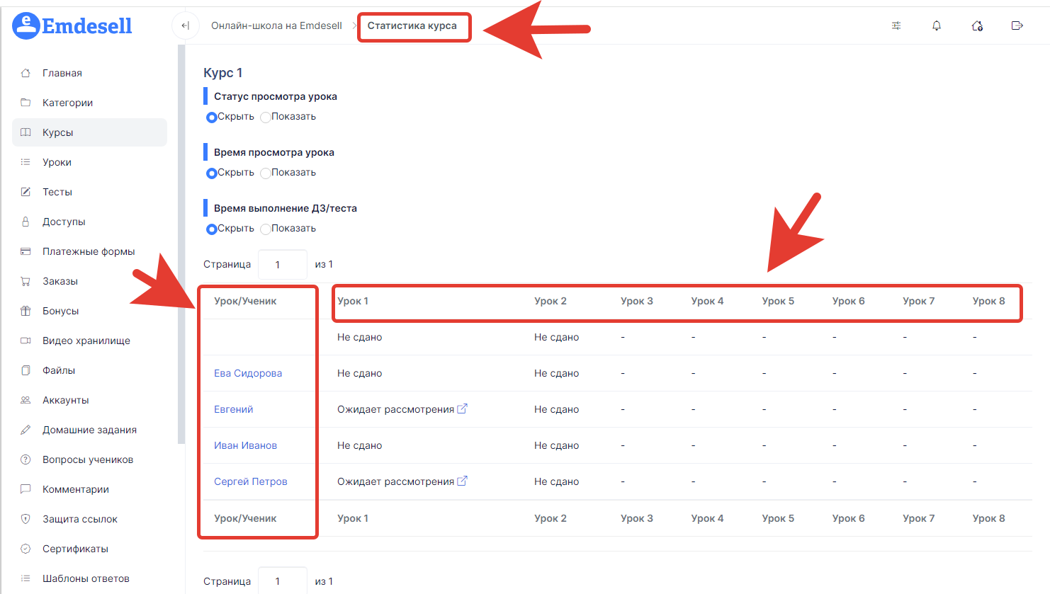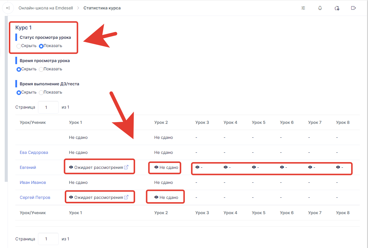В следующих столбцах таблицы будет отображение названий уроков курса и статусы по урокам напротив каждого ученика курса.