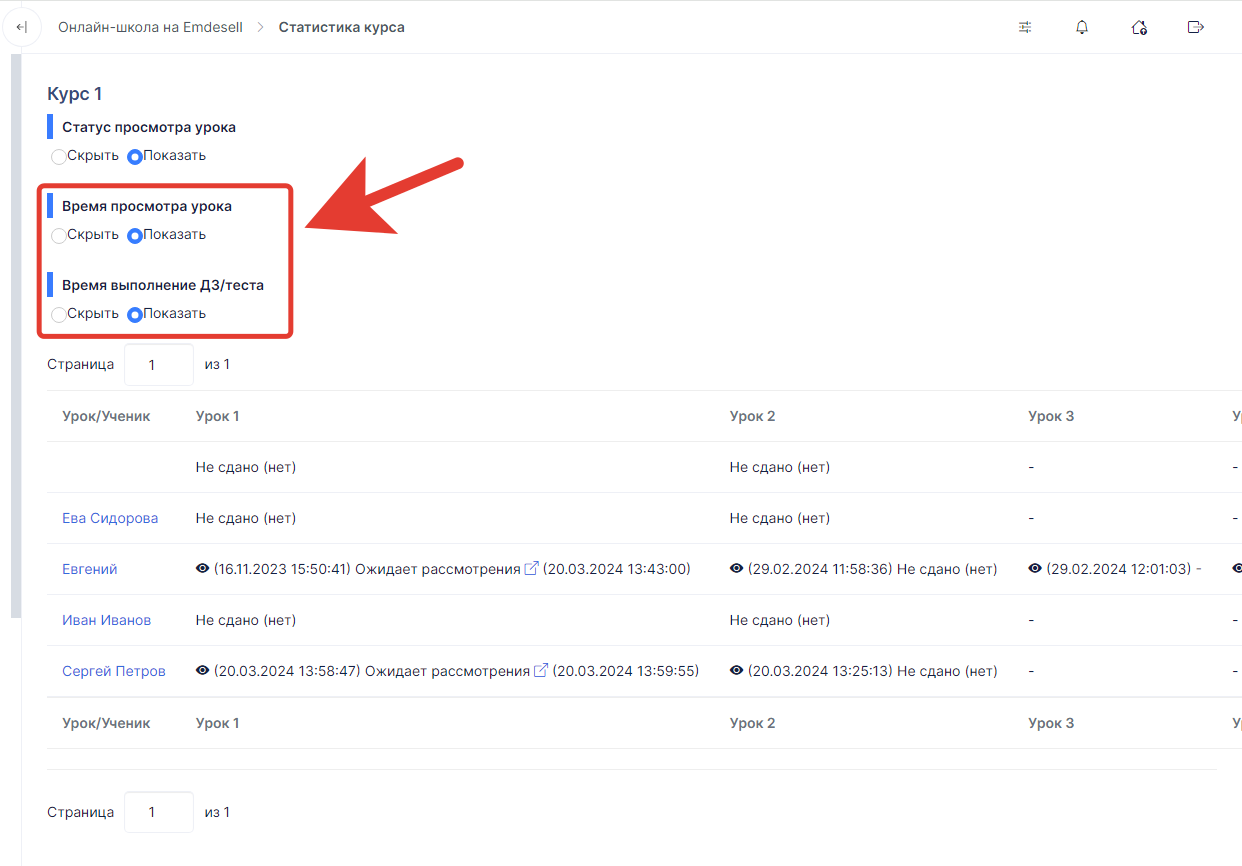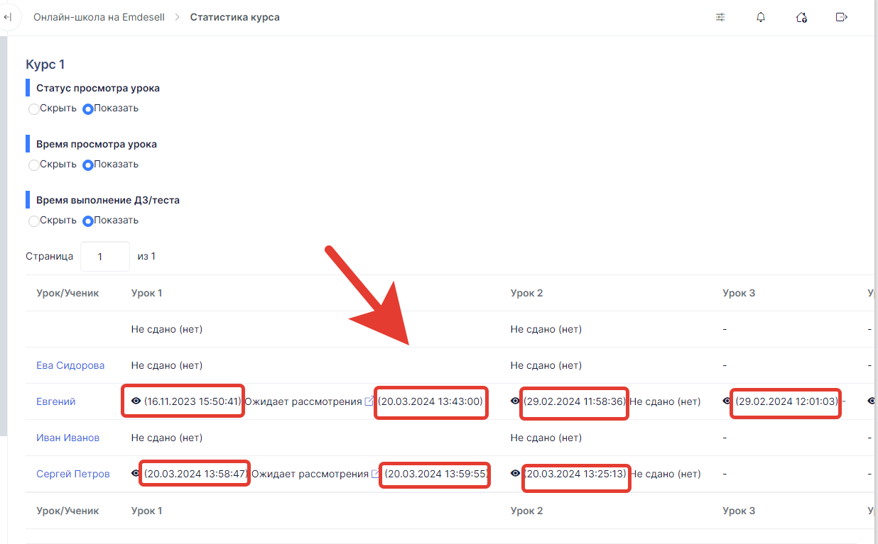После включения этих опций в таблице будет указана доп. информация в виде даты/времени просмотра уроков и даты/времени отправки дз или тестов в уроках от учеников.
