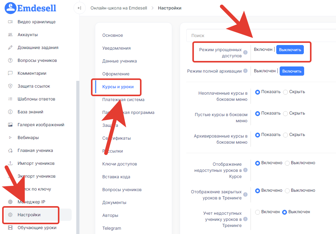 Это означает, что у тех учеников, у которых будет открыт доступ - первый курс или второй курс, будут открыты уроки - Третьего курса.
