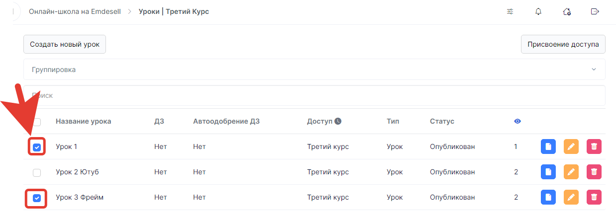 С помощью данной кнопки можно присвоить Доступ или Доступы к выбранным урокам в курсе.