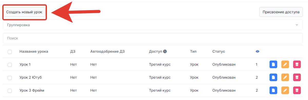 С помощью данной кнопки - можно создать новый урок в курсе.