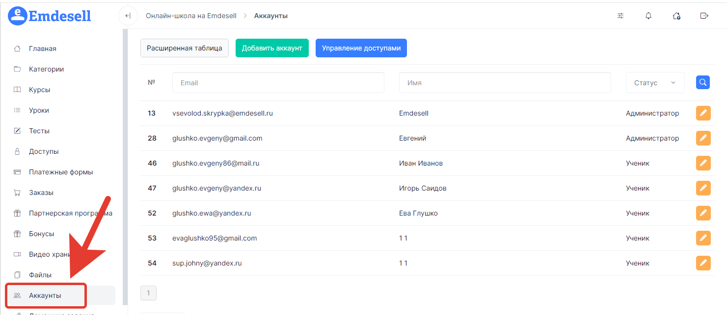 Для начала необходимо перейти в административную панель школы, в раздел Аккаунты.