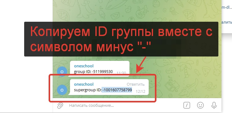 - Копируем ID с Telegram вместе с символом минус «-», т.е. в данном примере копируем такой ID -1001607758799