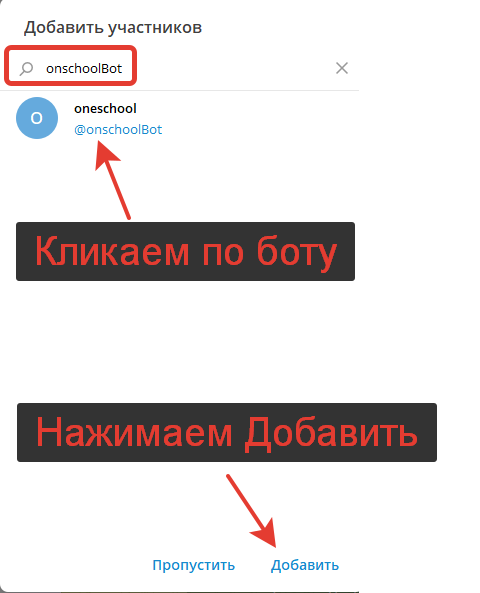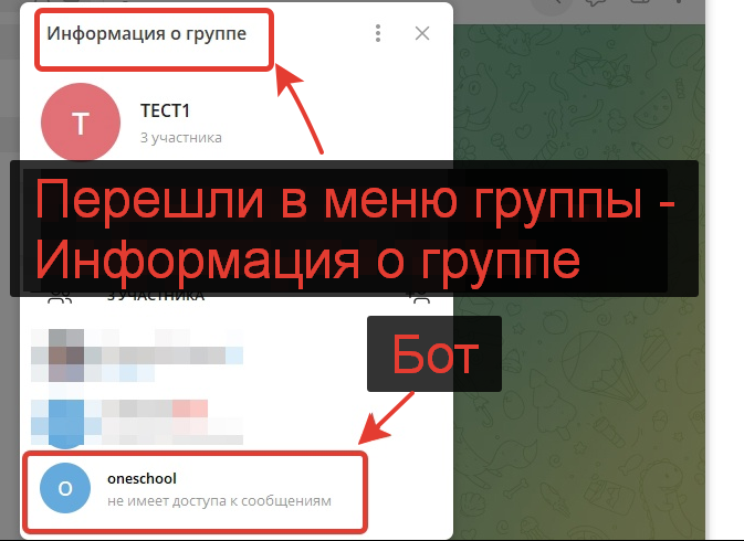 - В качестве еще одного участника добавляем созданного бота в Telegram для школы.