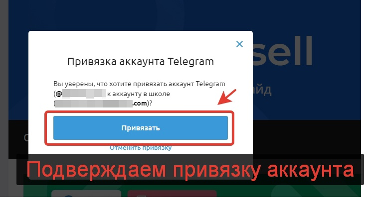 Далее, после авторизации в школе, появится окно привязки аккаунта Telegram, где нажимаем кнопку — Привязать.