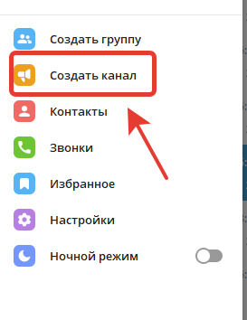 - Переходим в приложение Telegram и в меню приложения выбираем создать канал.