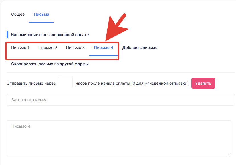 Можно создать одно письмо или цепочку (несколько) писем о напоминании о незавершенной оплате